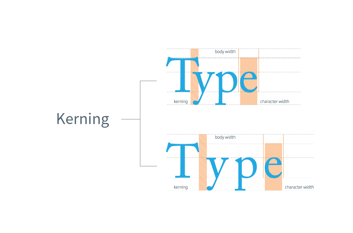 Kerning - refers to the spacing between pairs of letters in the same word. Not all letters are created equal, so certain pairs of letters can appear to form an entirely different letter. For example, the word "learn" can appear to look like "leam" without kerning. With kerning, the designer can create an equal amount of space between letters for more easily readable text.